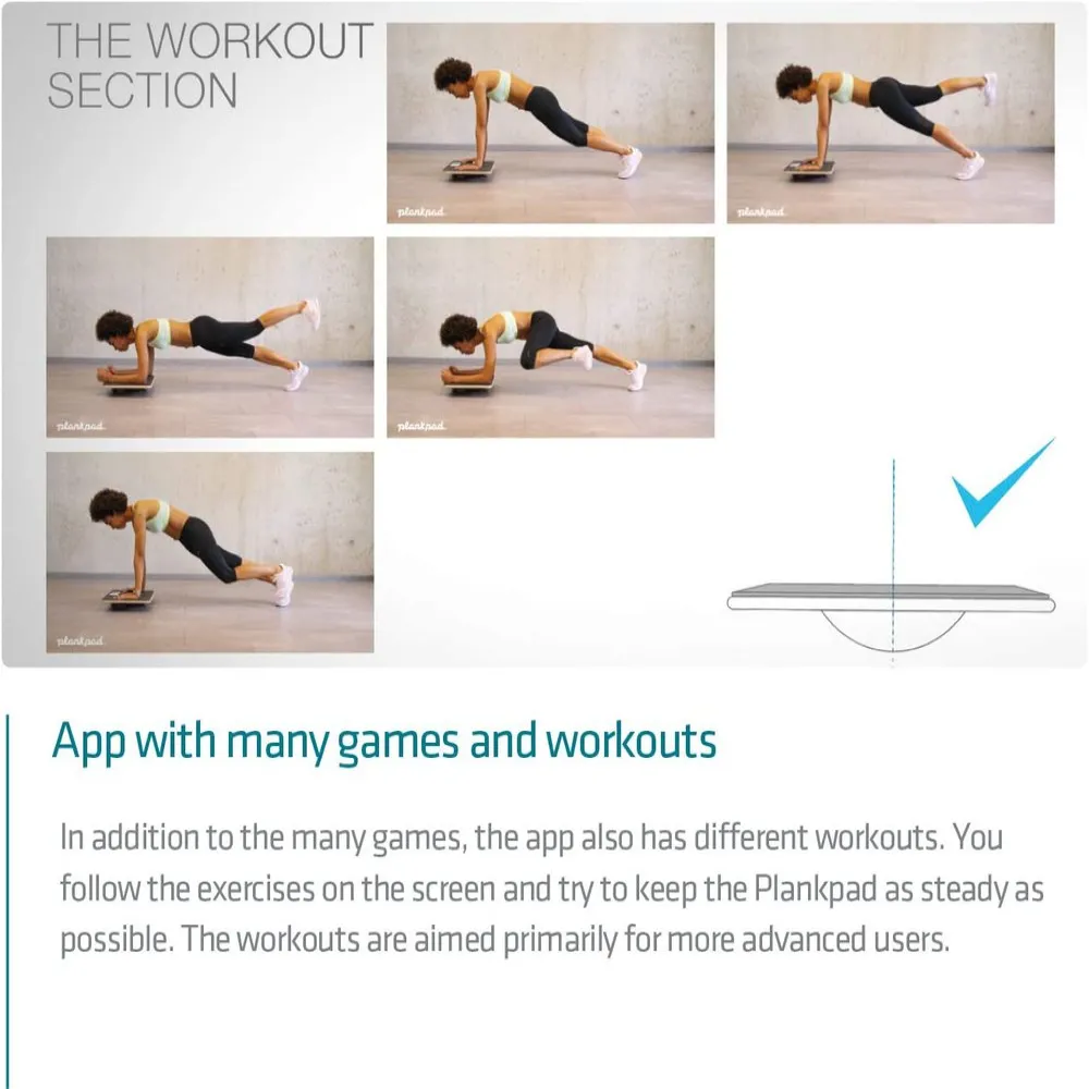 Plankpad comes with a fitting app with many games and workouts. Your training is much more fun. The app is synchronised with the Plankpad. The movements you perform control the games and workouts. The playful training distracts you and makes you last much longer during the exercises.